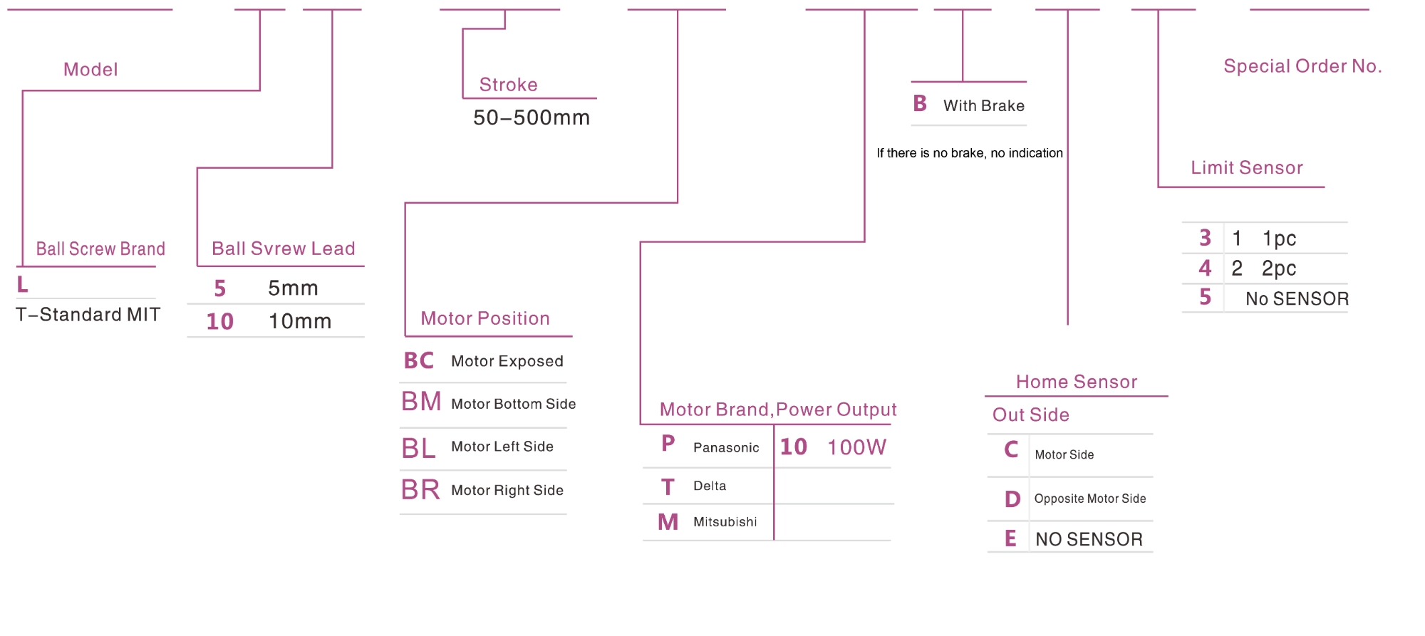 | 사용 위치 | 구동 모드 | 모델 사양 | 모터 출력(와트) | 너비(mm) | 반복성(mm) | 볼 스크류 사양 | 최대 탑재량(kg) | 최대 속도 (mm/s) *1 | ||