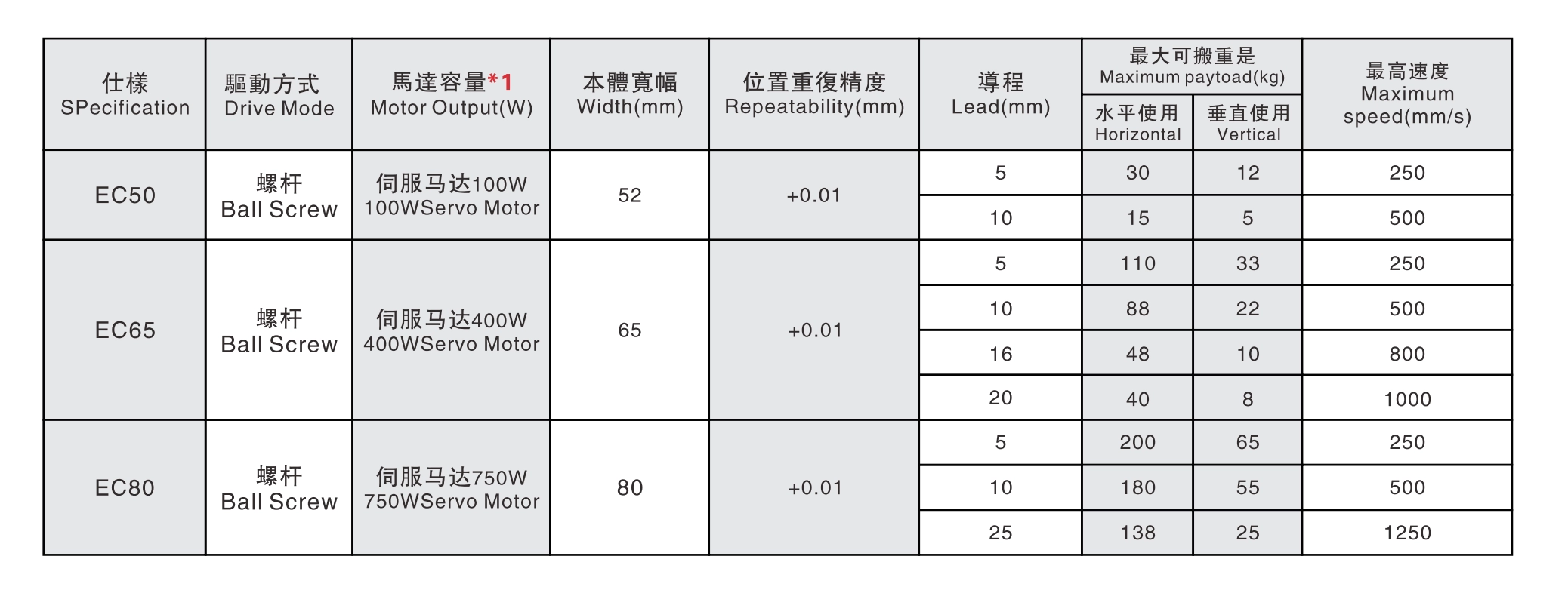 | 표준 환경 | 볼 스크류 | EC 50 | 100와트 | 52 | ±0.01 | 12 | 5 | 30 | 12 | 250 |