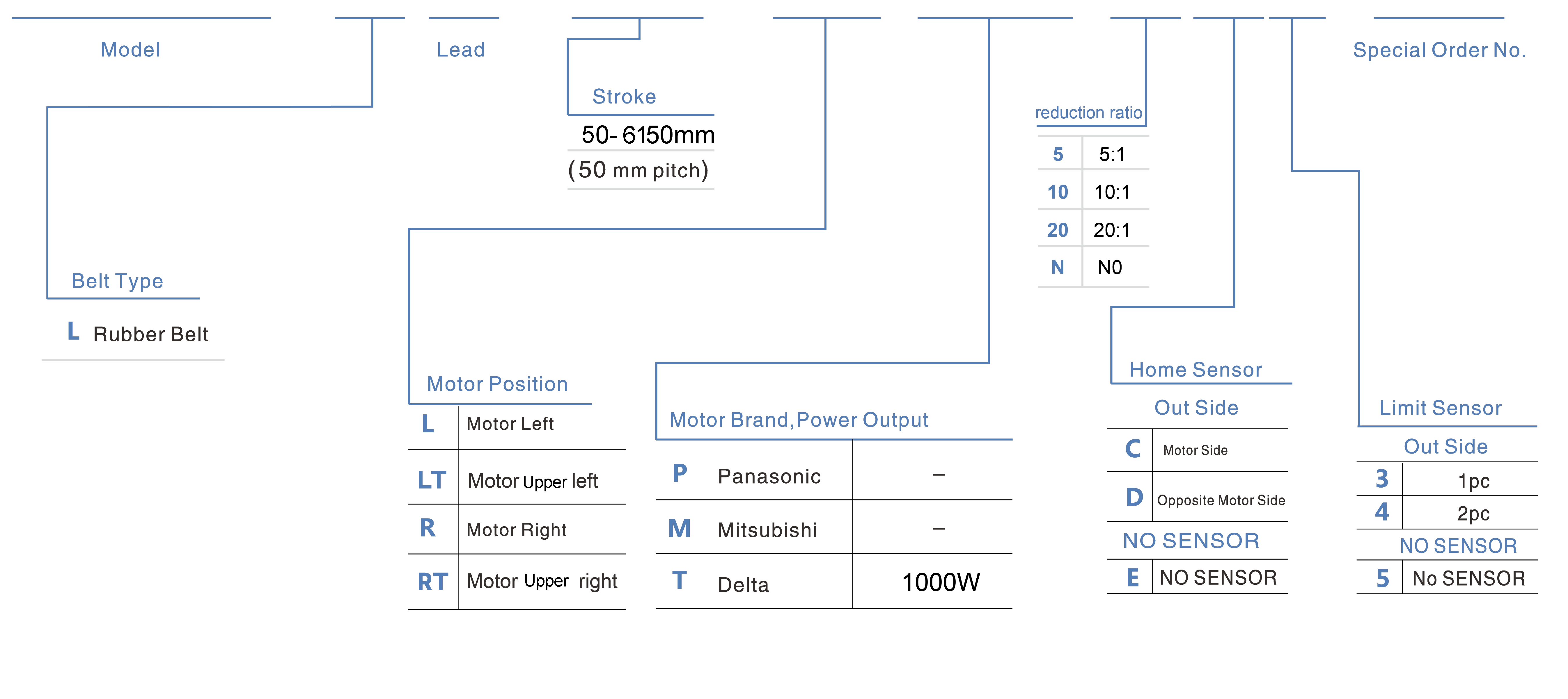 | 사용 위치 | 구동 모드 | 모델 사양 | 감속기 메커니즘 | 모터 출력 (w) | 너비(mm) | 반복성 (mm) | 벨트 사양 | 최대 탑재량(kg) | 최대 속도 (mm/s) *1 | ||