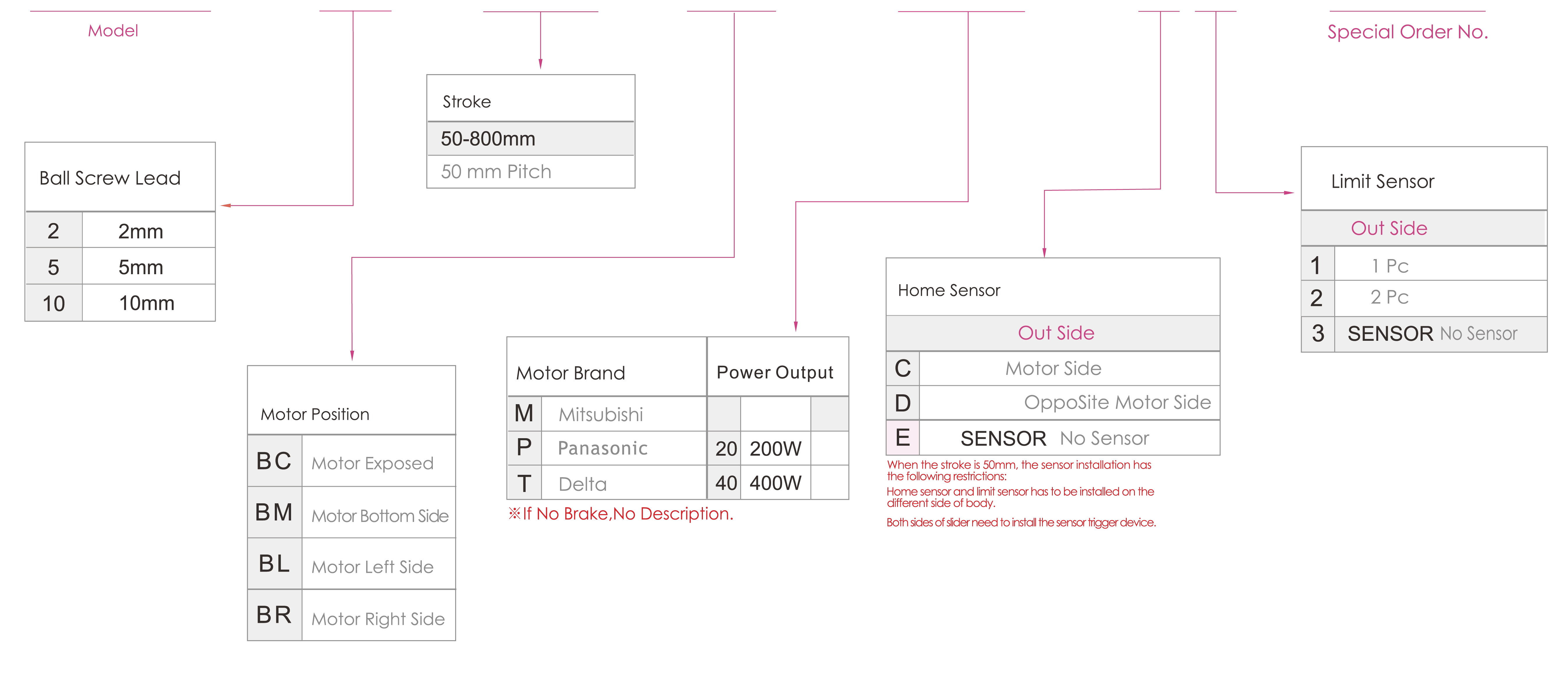| 사용 위치 | 구동 모드 | 모델 사양 | 모터 출력(와트) | 너비(mm) | 반복성(mm) | 볼 스크류 사양 | 최대 탑재량(kg) | 최대 속도 (mm/s) *1 | ||