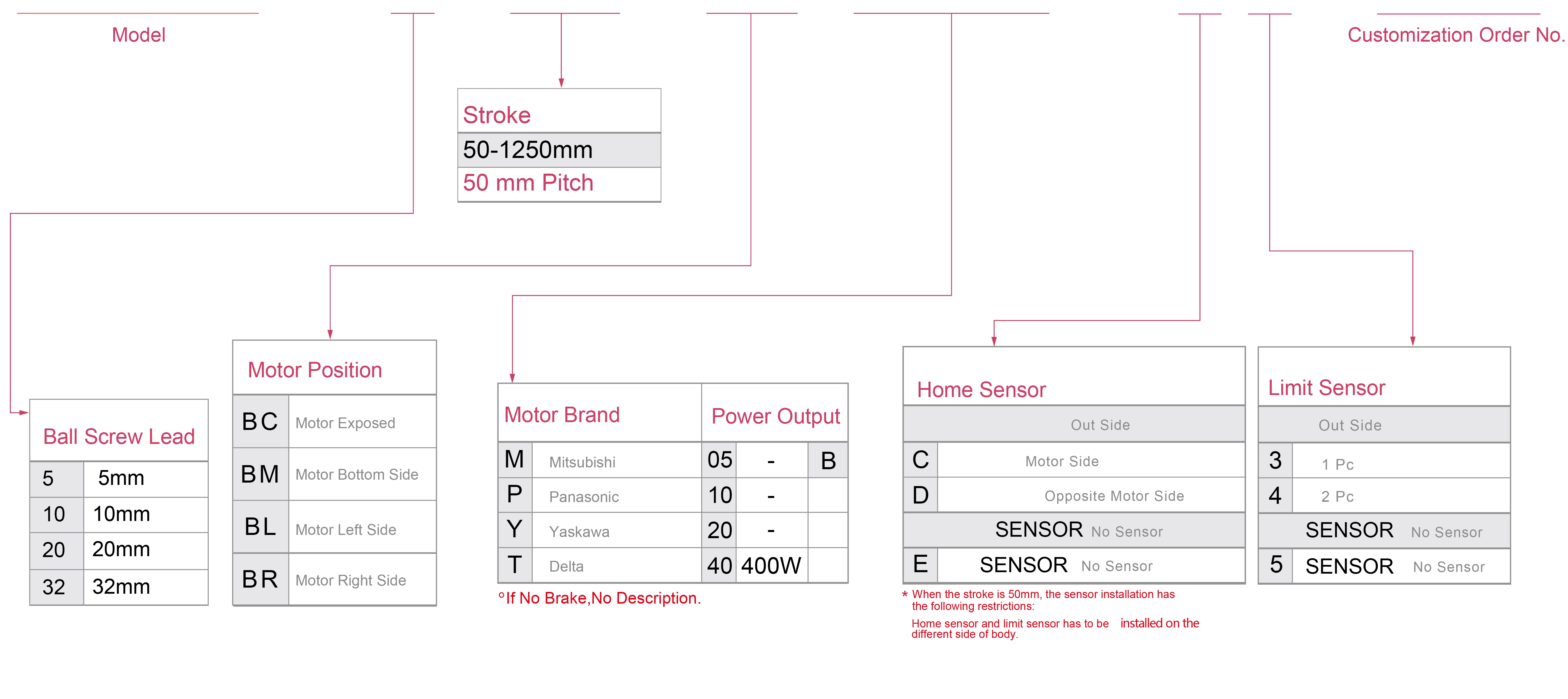 | 사용 위치 | 구동 모드 | 모델 사양 | 모터 출력 (w) | 너비(mm) | 반복성 (mm) | 볼 스크류 사양 | 최대 탑재량(kg) | 최대 속도 (mm/s) *1 | ||