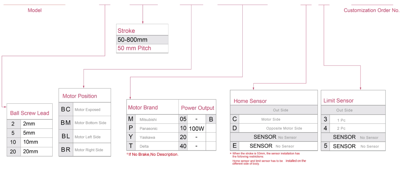 | 사용 위치 | 구동 모드 | 모델 사양 | 모터 출력 (w) | 너비(mm) | 반복성 (mm) | 볼 스크류 사양 | 최대 탑재량(kg) | 최대 속도 (mm/s) *1 | ||