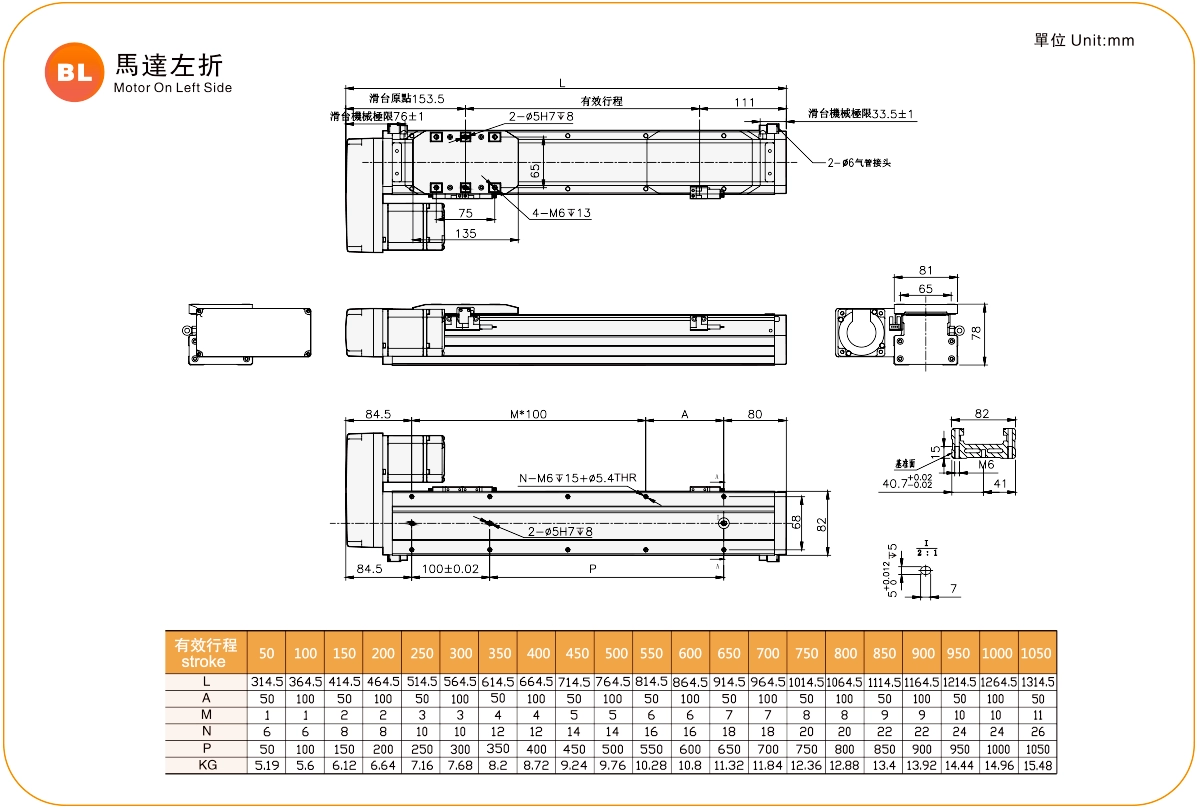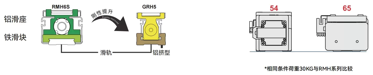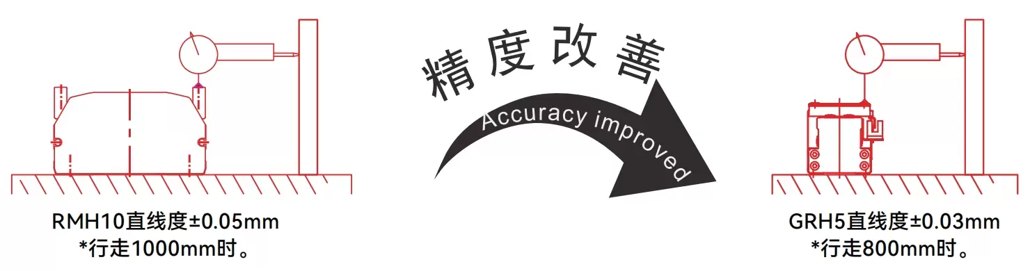 알루미늄 본체 구조를 사용하여 본체 강도가 크게 향상되었습니다. RMH5S/6S와 비교하여 강철 트랙을 알루미늄 본체에 매립한 후 연마하여 보행 높이 및 직진도 정밀도를 ±0.02mm 이하로 향상시켰습니다(RMH10/12 대비).