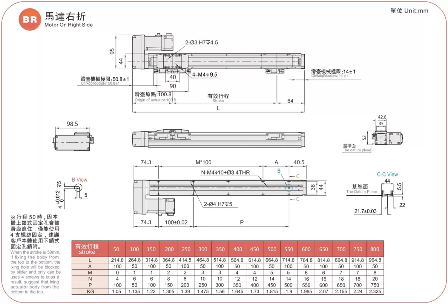 알루미늄 본체 구조를 사용하여 본체 강도가 크게 향상되었습니다. RMH5S/6S와 비교하여 강철 트랙을 알루미늄 본체에 매립한 후 연마하여 보행 높이 및 직진도 정밀도를 ±0.02mm 이하로 향상시켰습니다(RMH10/12 대비).