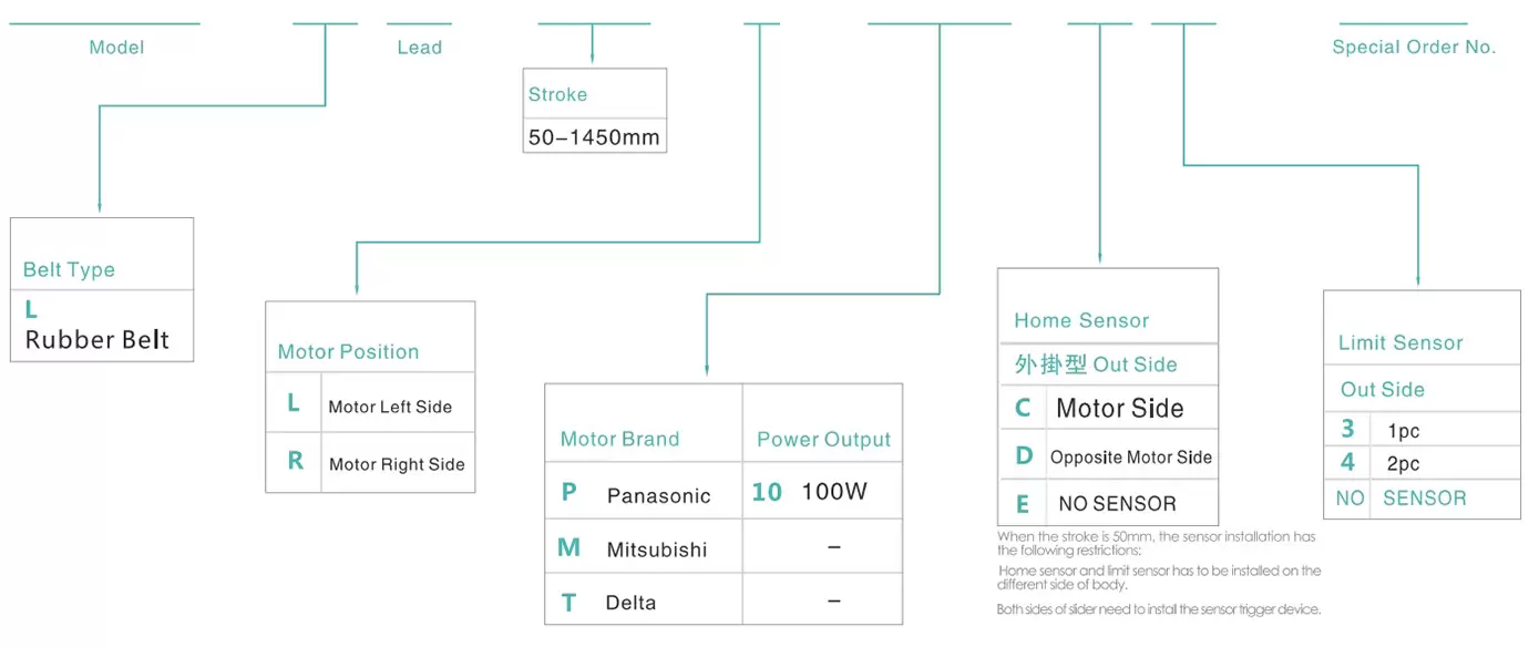 | 사용 위치 | 구동 모드 | 모델 사양 | 감속기 메커니즘 | 모터 출력 (w) | 너비(mm) | 반복성 (mm) | 벨트 사양 | 최대 탑재량(kg) | 최대 속도 (mm/s) *1 | ||