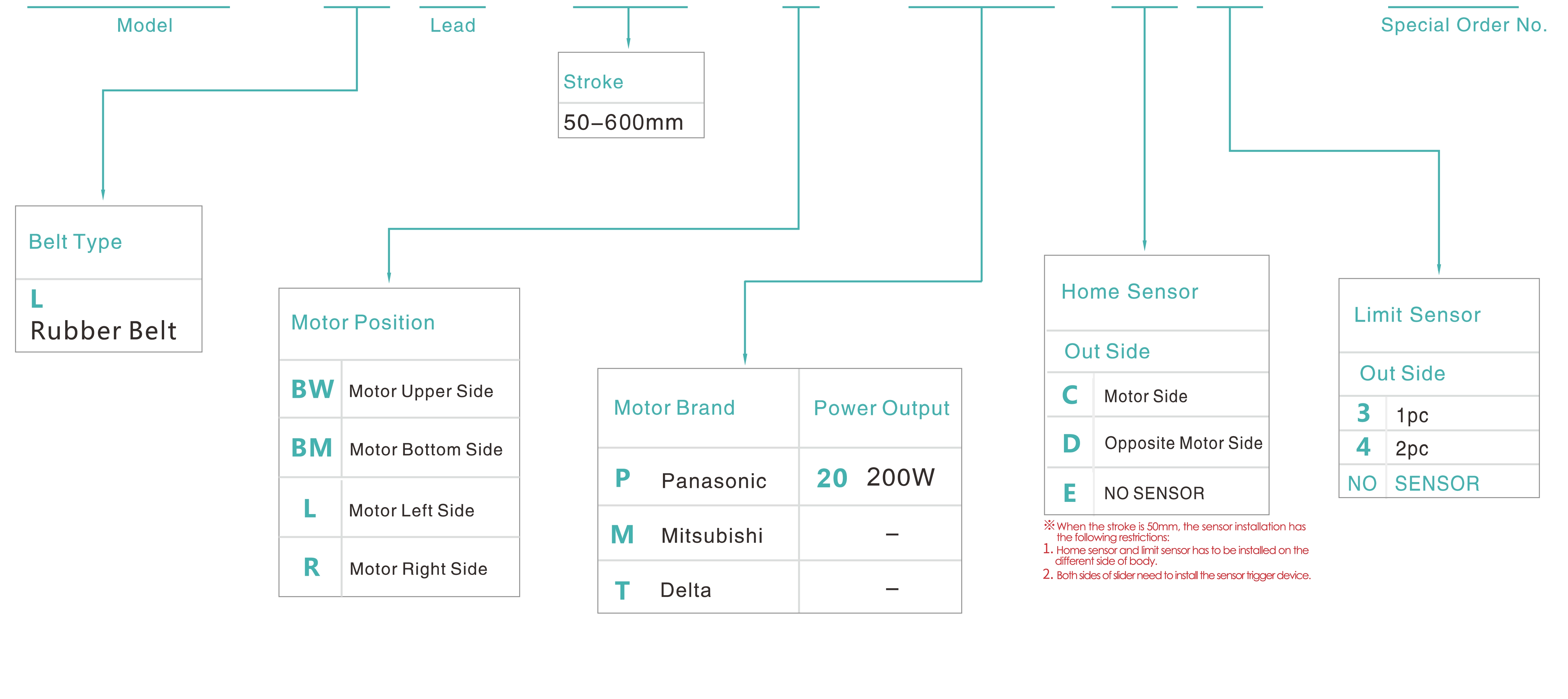 | 사용 위치 | 구동 모드 | 모델 사양 | 감속기 메커니즘 | 모터 출력 (w) | 너비(mm) | 반복성 (mm) | 벨트 사양 | 최대 탑재량(kg) | 최대 속도 (mm/s) *1 | ||