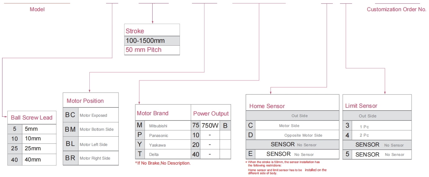 | 사용 위치 | 구동 모드 | 모델 사양 | 모터 출력 (w) | 너비(mm) | 신체의 높이 (mm) | 반복성 (mm) | 볼 스크류 사양 | 최대 탑재량(kg) | 최대 속도 (mm/s) *1 | ||||||||||