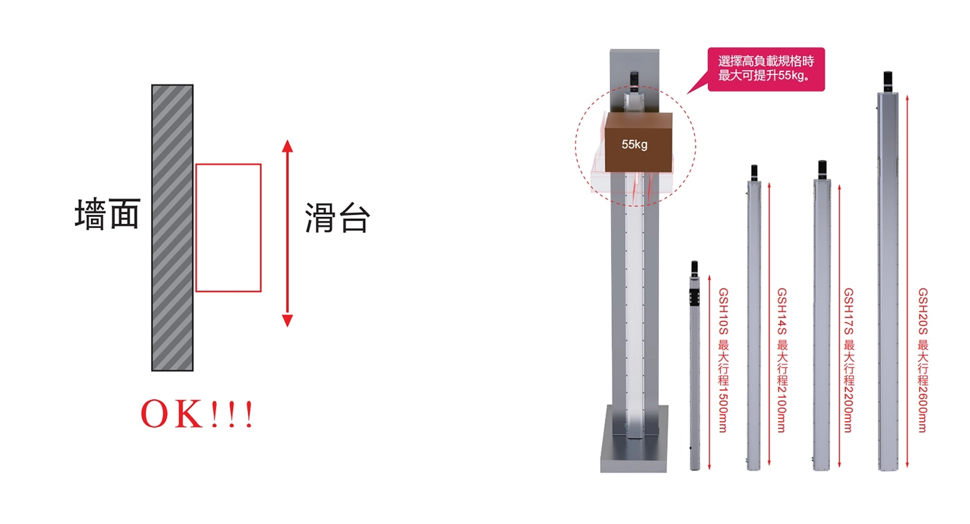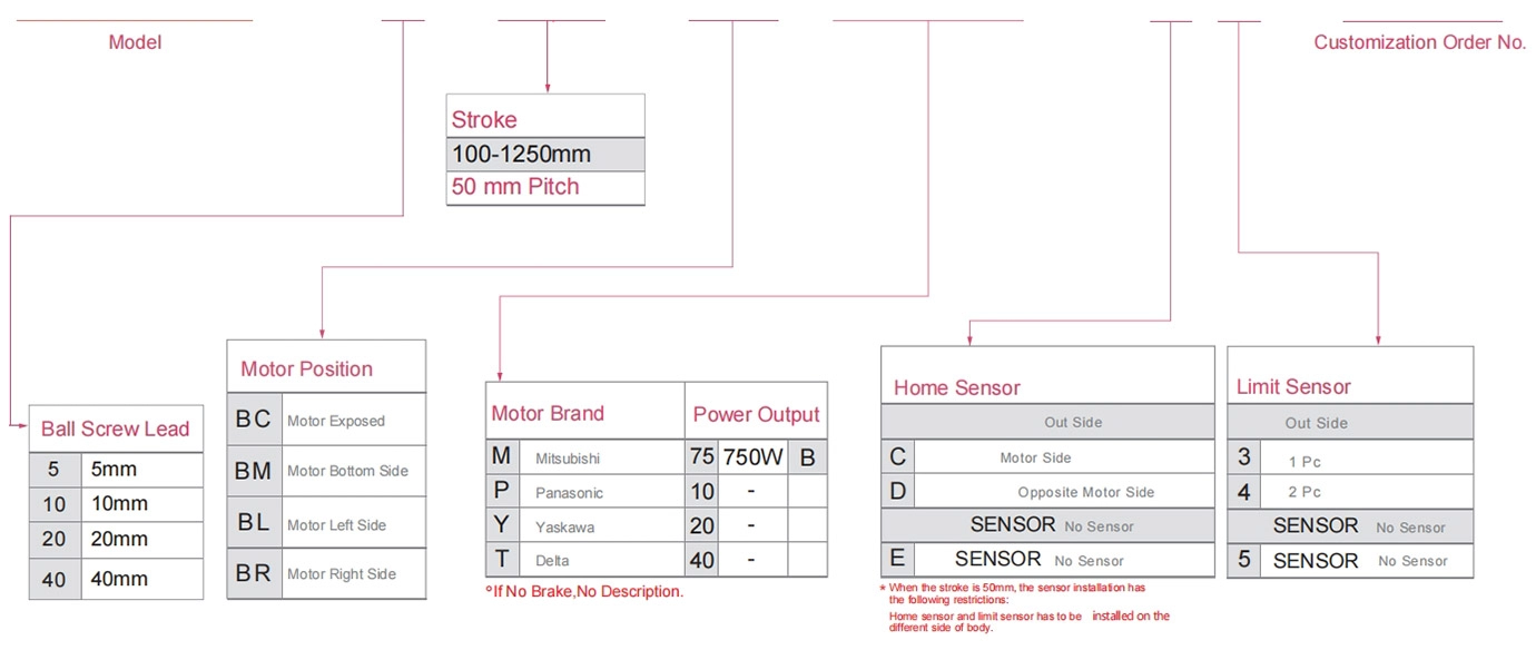 | 사용 위치 | 구동 모드 | 모델 사양 | 모터 출력 (w) | 너비(mm) | 신체의 높이 (mm) | 반복성 (mm) | 볼 스크류 사양 | 최대 탑재량(kg) | 최대 속도 (mm/s) *1 | ||||||||||