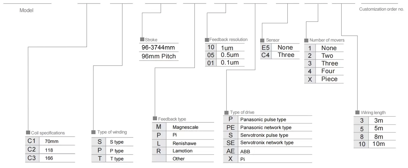| 사용 위치 | 구동 모드 | 모델 사양 | 모터 사양 | 본체의 너비(mm) | 신체 높이(mm) | 반복성(mm) | 연속 추력(N) | 최대 추력(N) | lrms(A) | 최대 탑재량(kg) | 최대 속도 (mm/s) *1 |