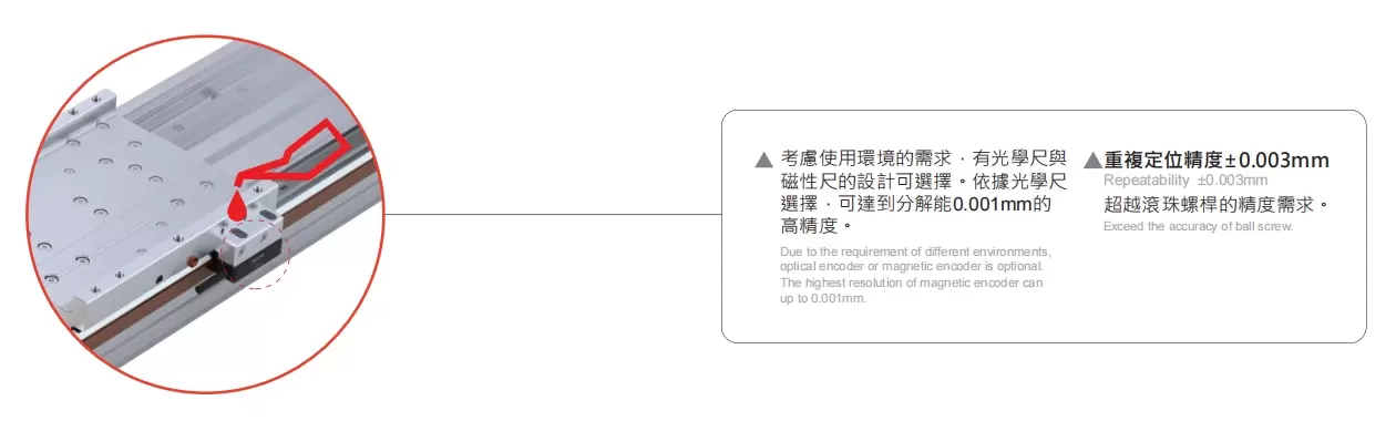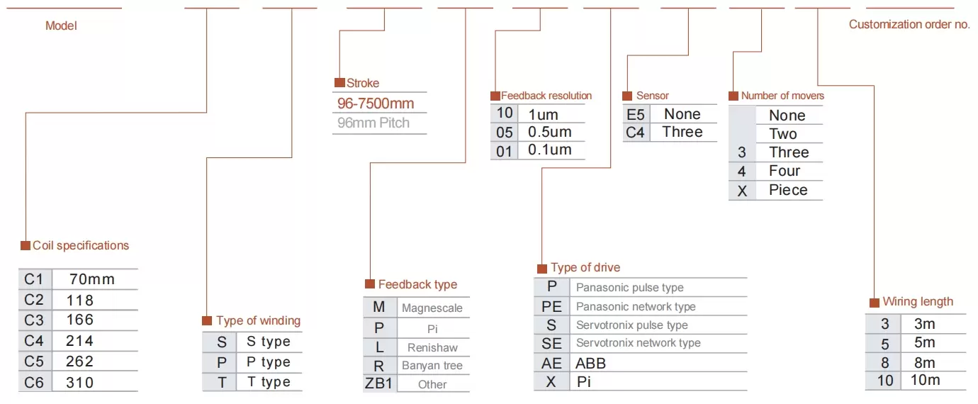 | 사용 위치 | 구동 모드 | 모델 사양 | 모터 사양 | 본체의 너비(mm) | 신체 높이(mm) | 반복성(mm) | 연속 추력(N) | 최대 추력(N) | lrms(A) | 최대 탑재량(kg) | 최대 속도 (mm/s) *1 |