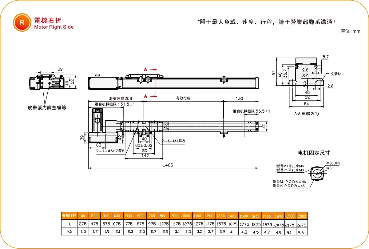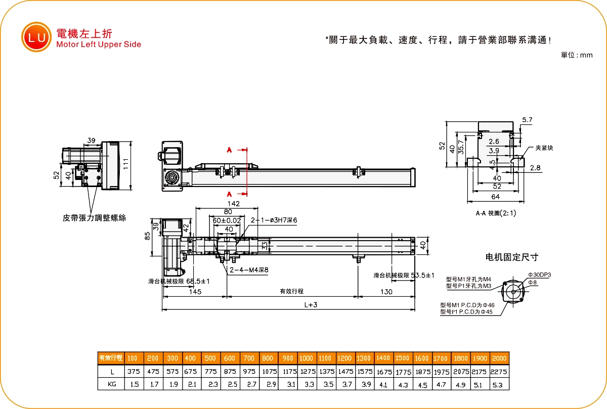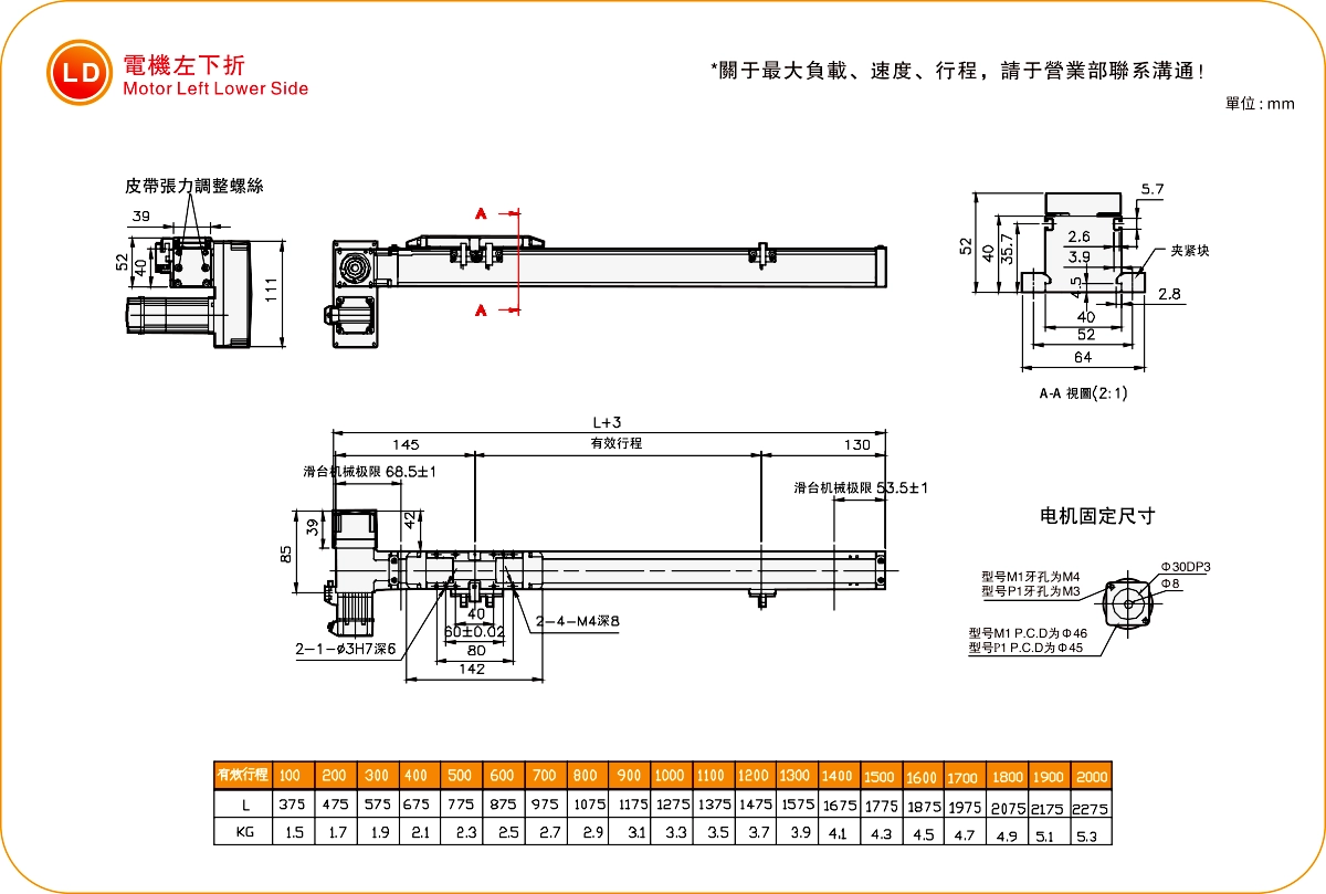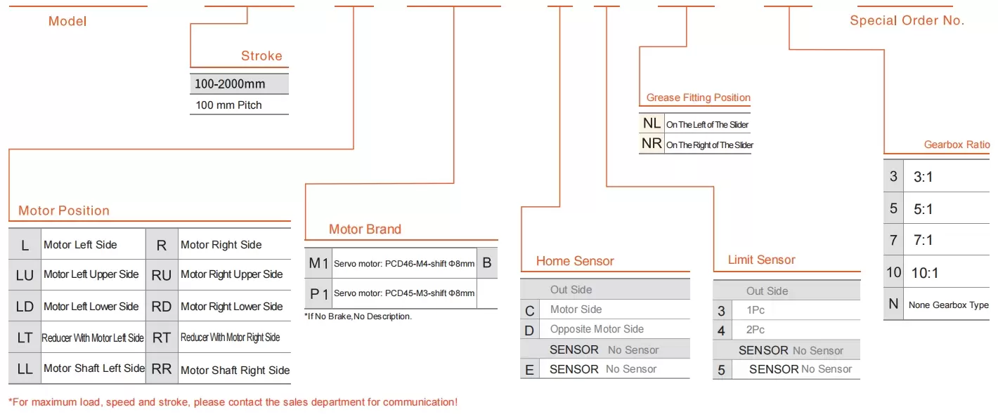 | 사용 위치 | 구동 모드 | 모델 사양 | 감속기 메커니즘 | 모터 출력 (w) | 너비(mm) | 반복성 (mm) | 벨트 사양 | 최대 탑재량(kg) | 최대 속도 (mm/s) *1 | ||
