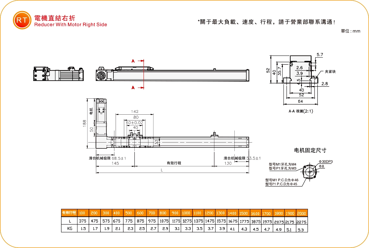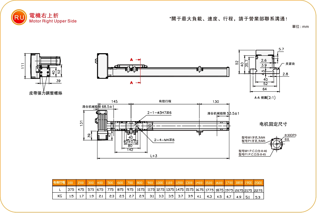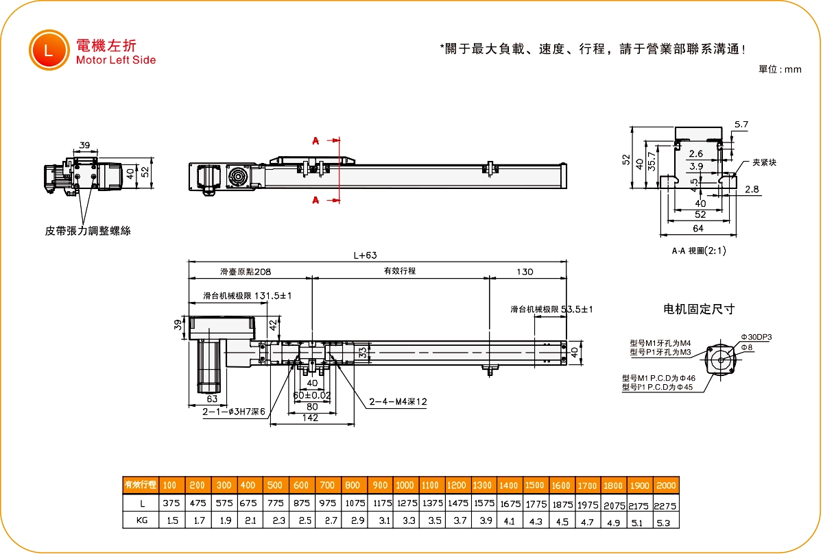 | 사용 위치 | 구동 모드 | 모델 사양 | 감속기 메커니즘 | 모터 출력 (w) | 너비(mm) | 반복성 (mm) | 벨트 사양 | 최대 탑재량(kg) | 최대 속도 (mm/s) *1 | ||