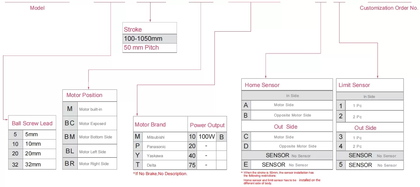| 사용 위치 | 구동 모드 | 모델 사양 | 모터 출력 (w) | 너비(mm) | 반복성 (mm) | 볼 스크류 사양 | 최대 탑재량(kg) | 최대 속도 (mm/s) *1 | ||