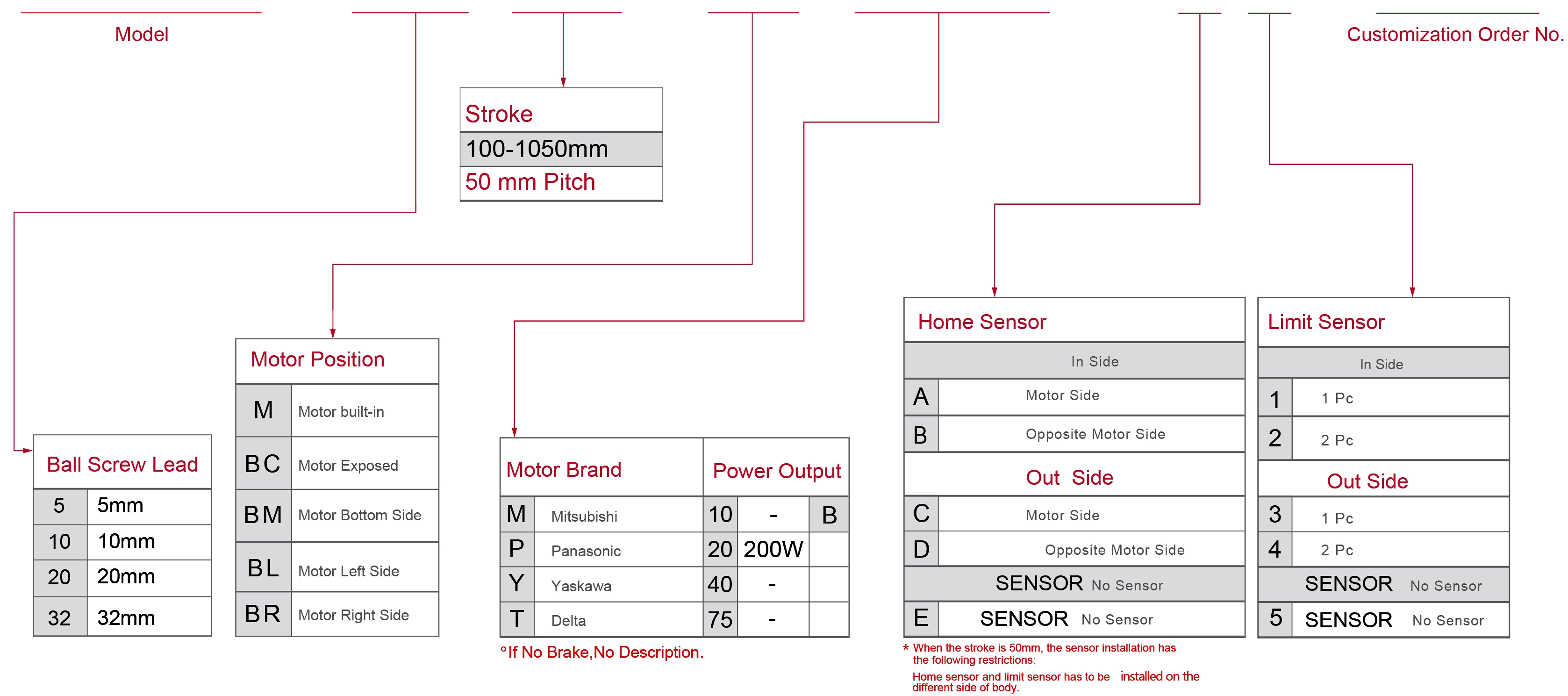 | 사용 위치 | 구동 모드 | 모델 사양 | 모터 출력 (w) | 너비(mm) | 반복성 (mm) | 볼 스크류 사양 | 최대 탑재량(kg) | 최대 속도 (mm/s) *1 | ||