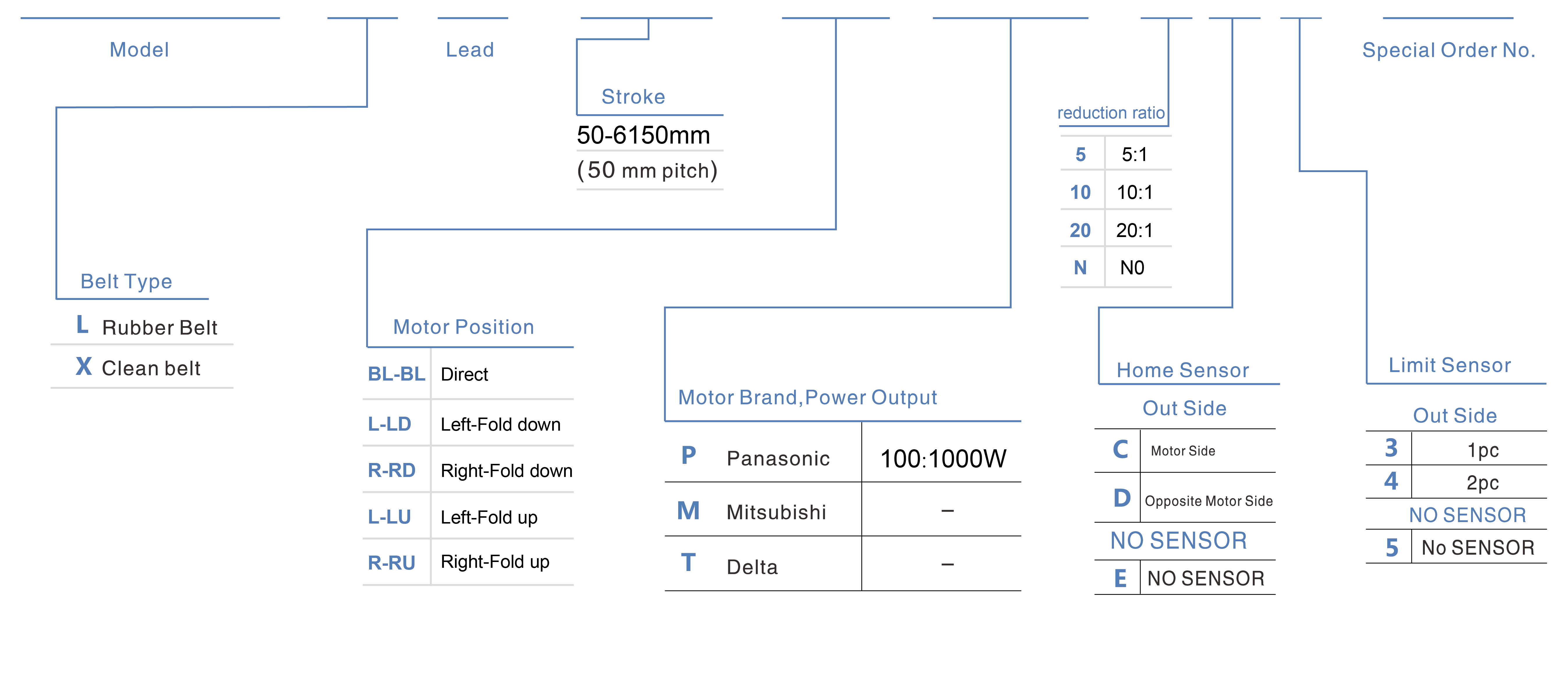 | 사용 위치 | 구동 모드 | 모델 사양 | 감속기 메커니즘 | 모터 출력 (w) | 너비(mm) | 반복성 (mm) | 벨트 사양 | 최대 탑재량(kg) | 최대 속도 (mm/s) *1 | ||