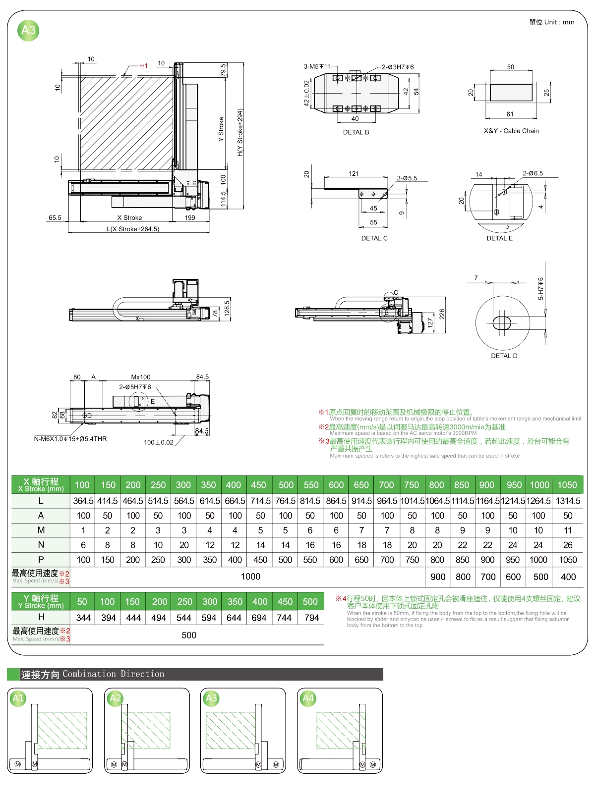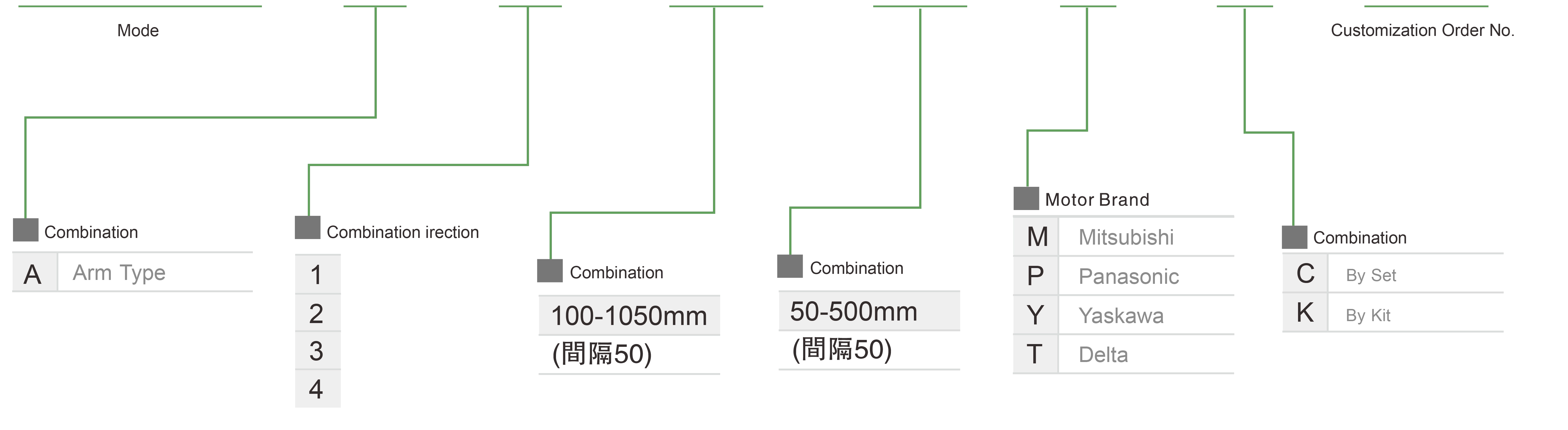 | 사용 위치 | 구동 모드 | 모델 사양 | 콤비네이션 | 축 번호 | 선두 | 최대 속도(mm/s) | 스트로크(mm) | ||||||