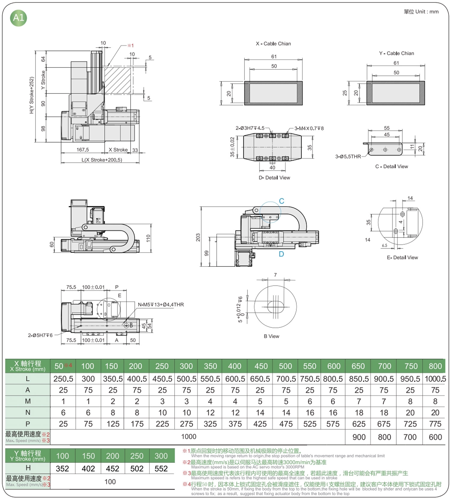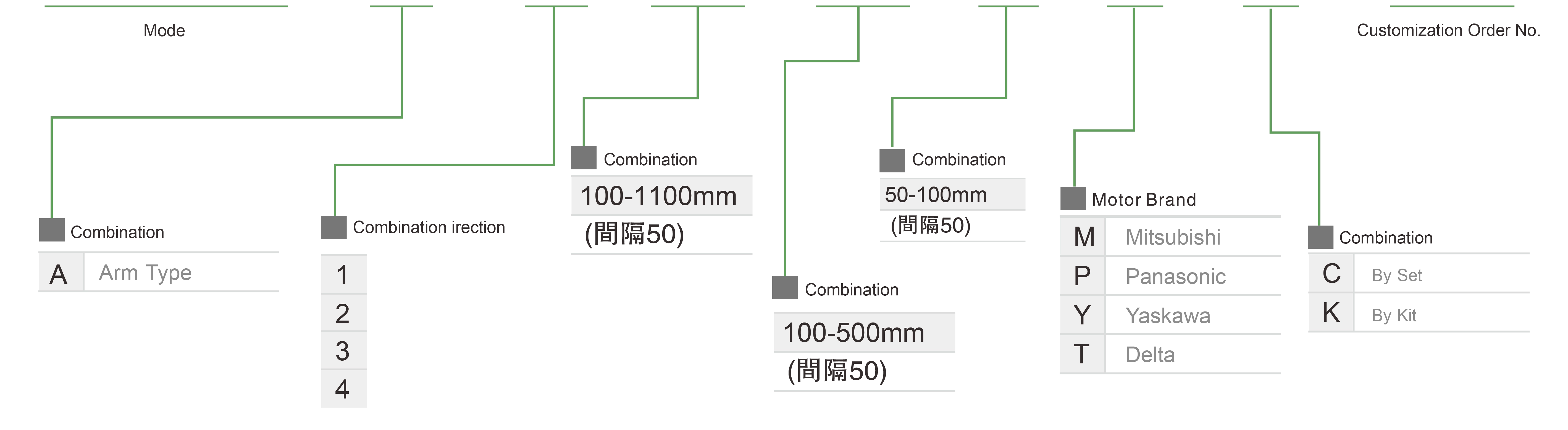 | 사용 위치 | 구동 모드 | 모델 사양 | 콤비네이션 | 축 번호 | 선두 | 최대 속도(mm/s) | 스트로크(mm) | ||||||