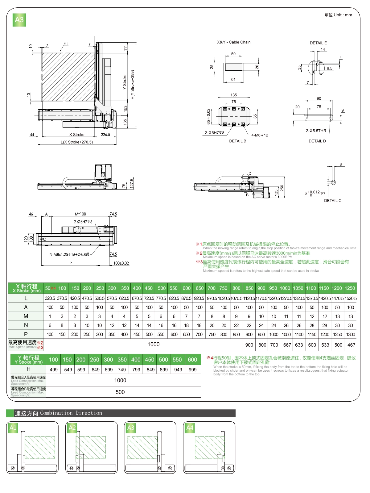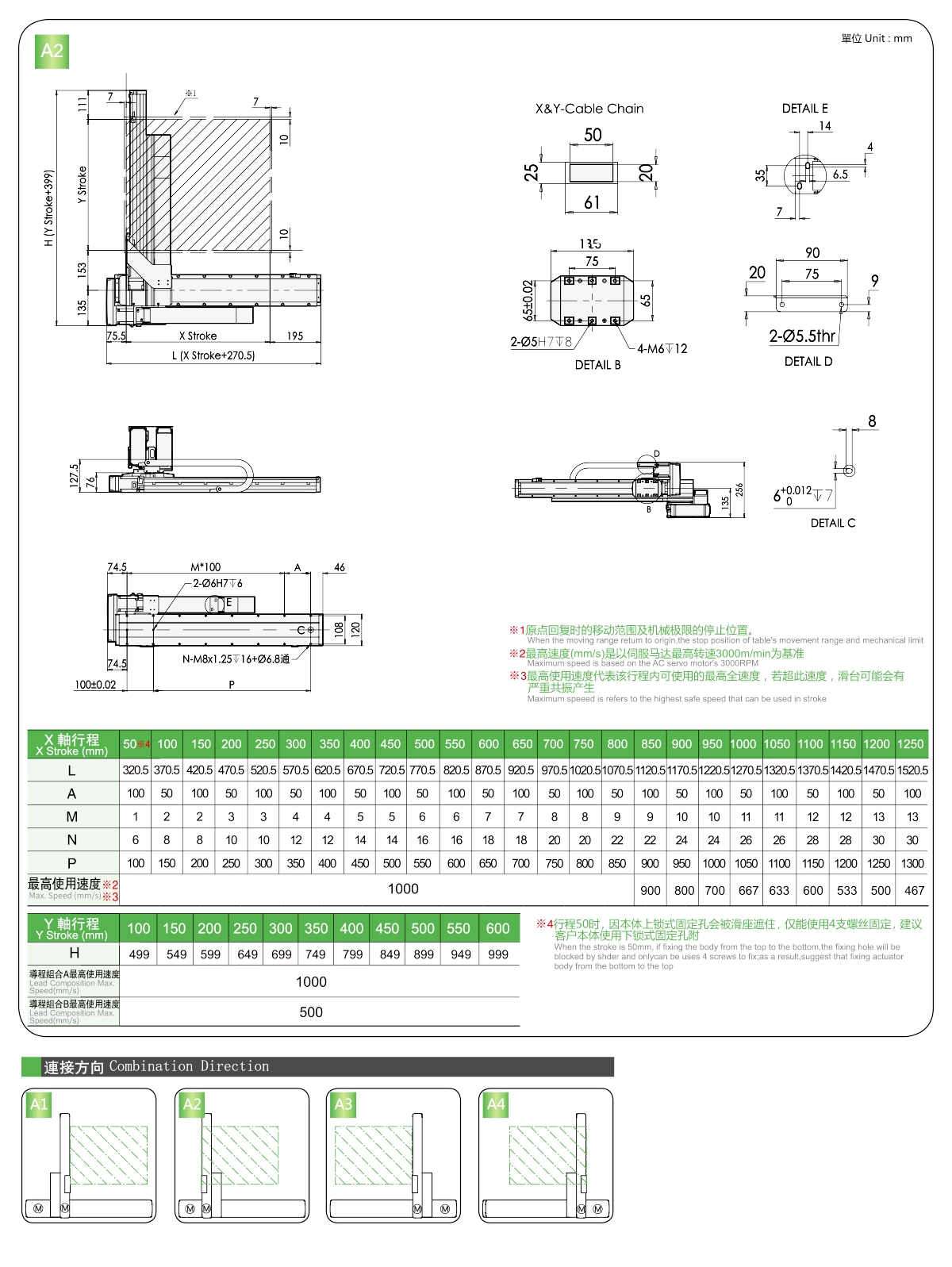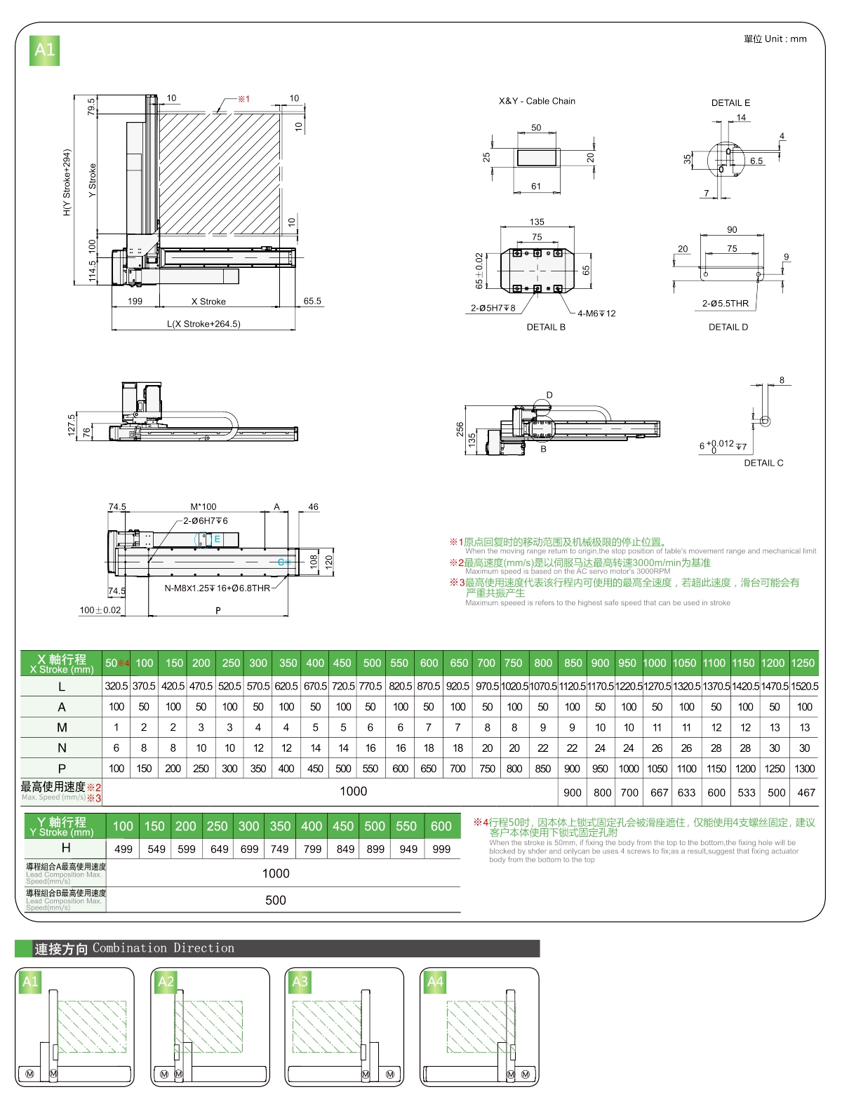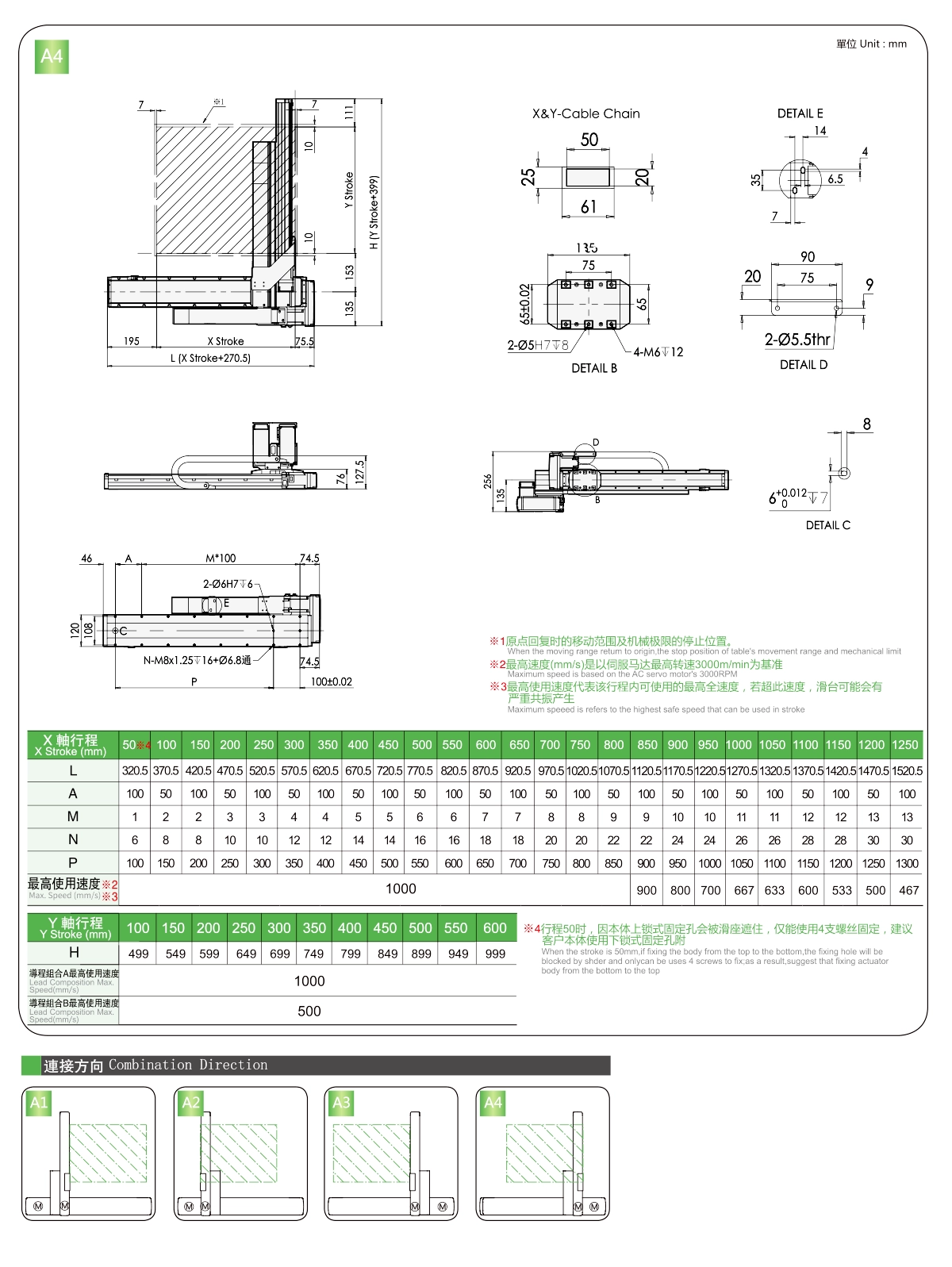 | 사용 위치 | 구동 모드 | 모델 사양 | 콤비네이션 | 축 번호 | 선두 | 최대 속도(mm/s) | 스트로크(mm) | ||||||