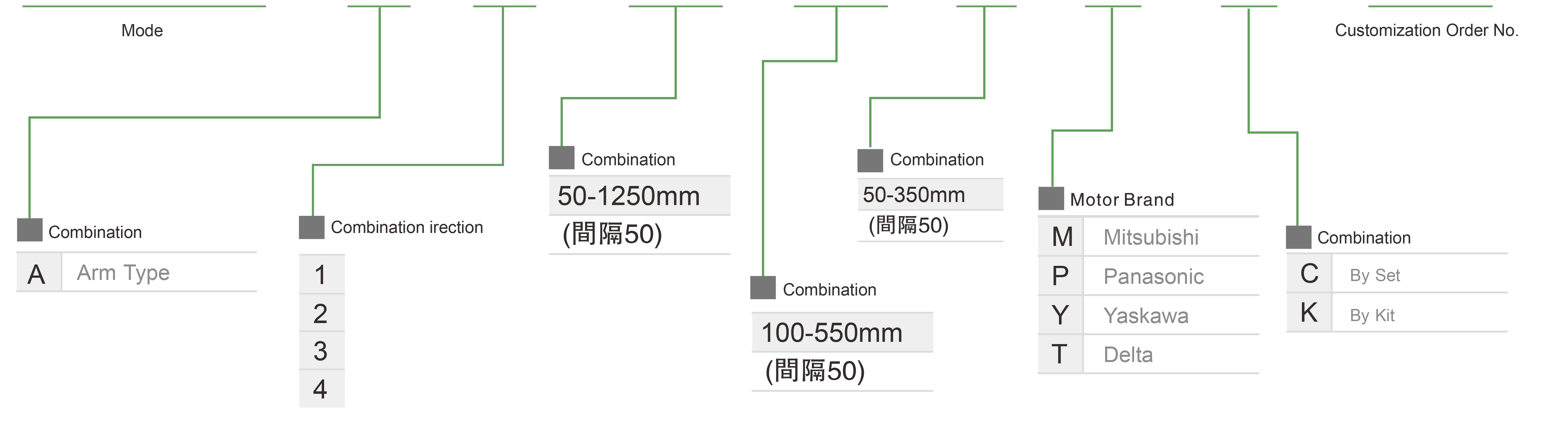 | 사용 위치 | 구동 모드 | 모델 사양 | 콤비네이션 | 축 번호 | 선두 | 최대 속도(mm/s) | 스트로크(mm) | ||||||