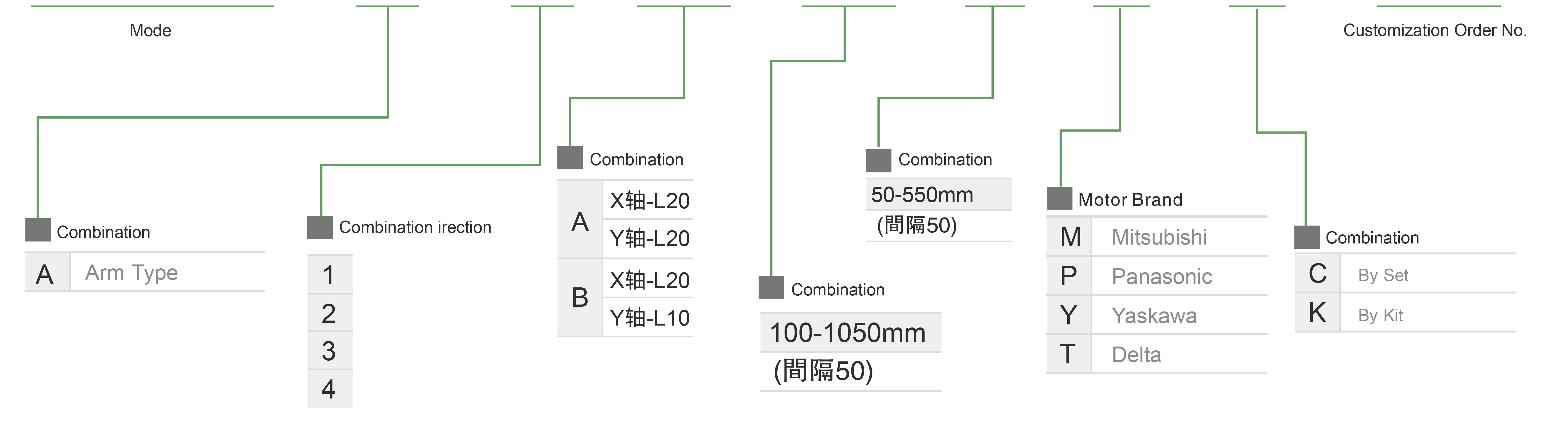 | 사용 위치 | 구동 모드 | 모델 사양 | 콤비네이션 | 축 번호 | 선두 | 최대 속도(mm/s) | 스트로크(mm) | ||||||
